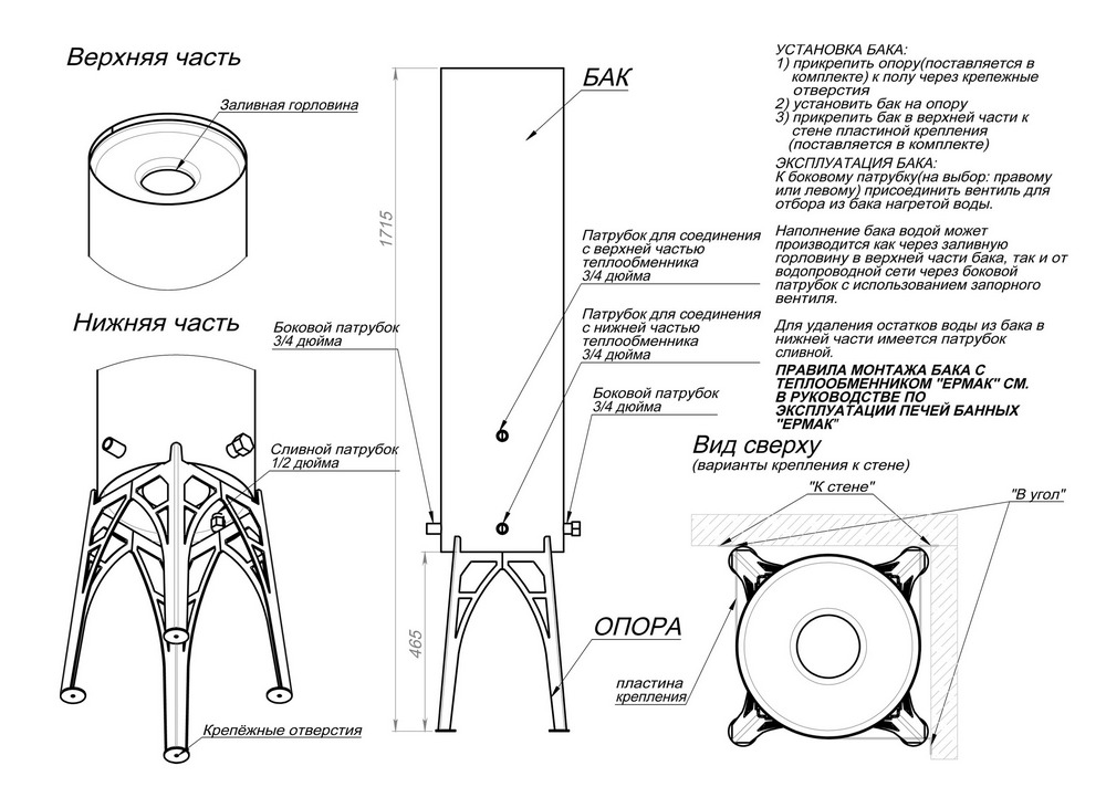 На баке расположены верхний и нижний штуцера (G3/4 наружная резьба) для подключения труб к теплообменнику (в комплект не входят). Два боковых штуцера для забора воды (G3/4 наружная резьба). На дне бака имеется сливной патрубок (G1/2 наружная резьба). Сверху находится заливная горловина.